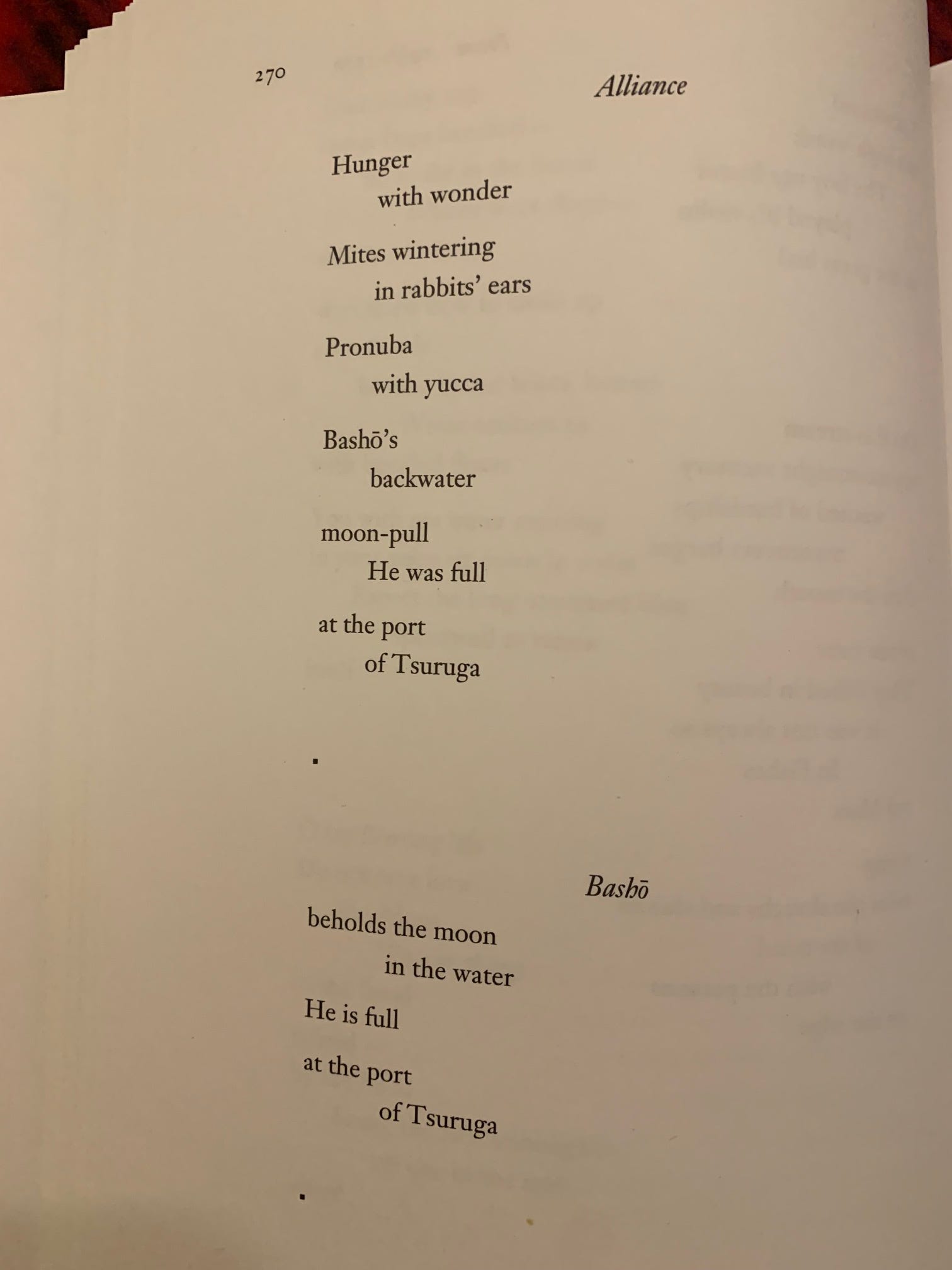 I have the impression that great photographers should also press the shutter with their eyes closed at the perfect moment, that photography is first and foremost intuition. Nan Goldin preferred not to wear glasses for her short-sighted eyes. Without those glasses she could not choose and focus precisely, but she had a a real gift foe the snapshot. And it prevented her as a photographer from selecting, from letting her norms define the photo. What is the real memory? Without selection. Without norms. To show it exactly as it was.Quickly, after last weeks Haiku experiences, Hugo Pictor’s journeys in the book pile took him from Harry Gilonis back to “Between Your House and Mine”: The Letters of Lorine Niedecker to Cid Corman, 1960-1970. In a letter Nidecker writes to Corman, Jan 10 1968, she compares a Bashō translation by Yuasa in her Penguin edition: