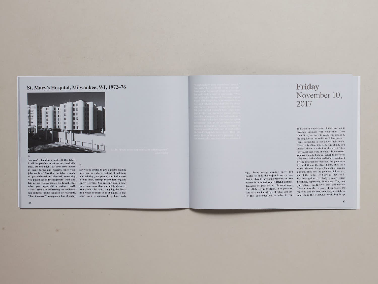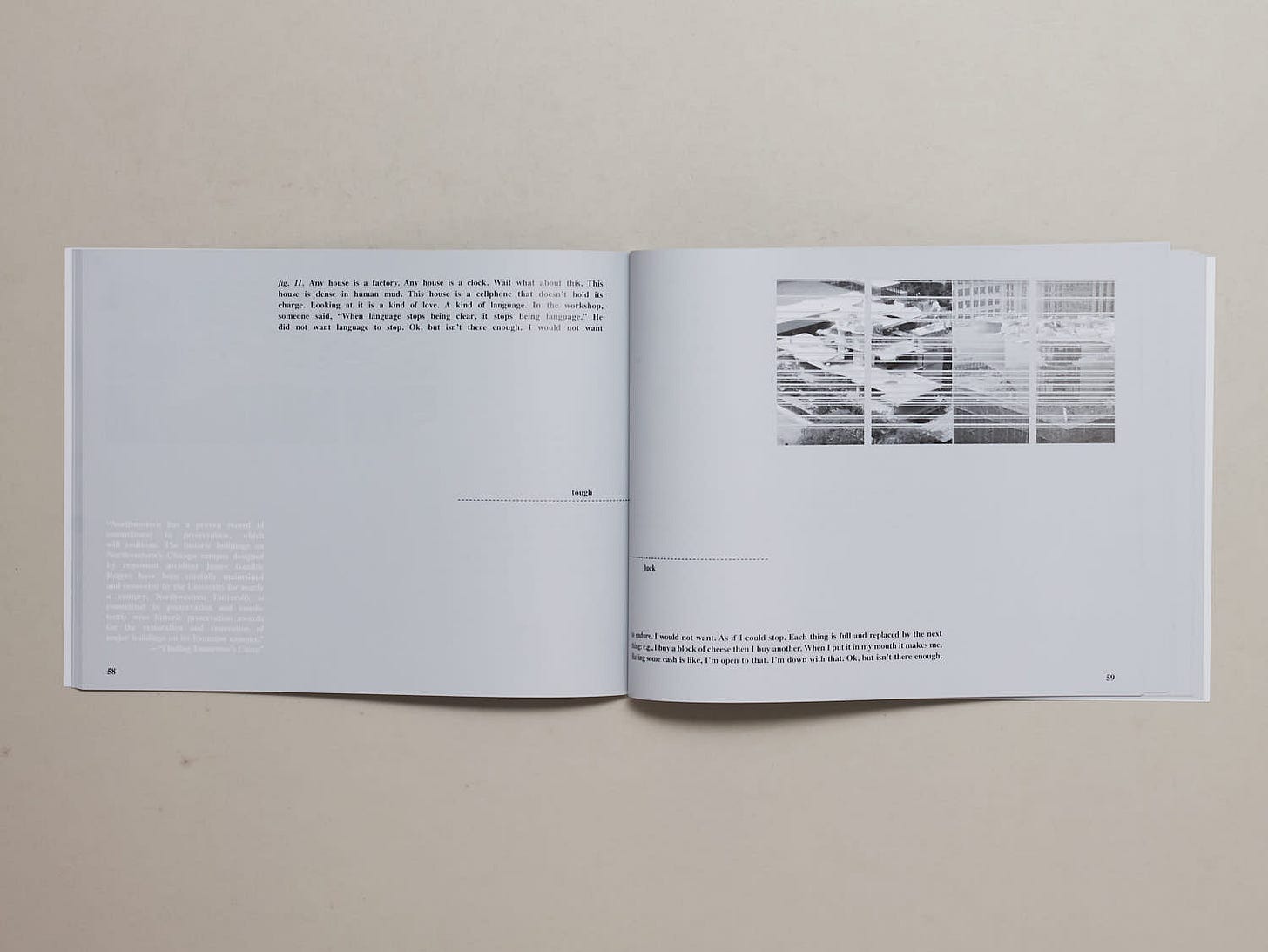 “I want to write an essay on scarcity” begins the book, although this paragraph is titled fig.1, which suggest it is a caption to the photo above: a black and white screen shot from an online time lapse film capturing the demolition of Prentice Women’s Hospital in Chicago in 2014, after it was denied preservation status as part of a proposed development by Northwestern University. The paragraph as a whole reads: