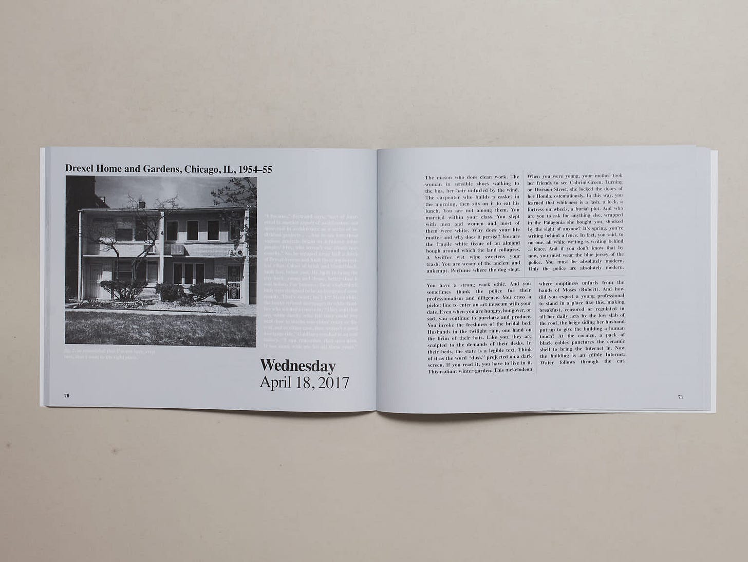 fig. 1. I want to write an essay on scarcity. To describe the city as an effect of deletion or decay: a shadow, a graveyard, a series of imaginary islands. I would begin, for instance, with the graves in Lincoln Park. I would say how the park was stripped of its corpses to make it clean and safe, a place where money stays. Or I would write about Daniel Burnham, who asked the city to build a harp of garbage in the lake. Who has time for that? I too live on trash. A woman’s face with an orange price tag on it. $7.99. A book of coupons. Wild onion collapsing in the throat. And what if the meek refuse to inherit?Altman’s book studies Brutalist Chicago architect Bertrand Goldberg, designer of many large, public housing and health facilities. To ‘study’ here means not only life and work, but the continued presence of his buildings (surviving and demolished), the attitudes and experiences people have with/in them, manifested in official documents, photos, memory, bodies, free association, conflicting emotions, disregard, &&&&.